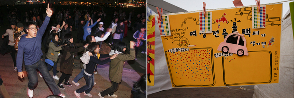 핑크색으로 덮인 ‘여성 전용의 어떤 것’은 ‘여성 보호’와 ‘여성 분리’란 두 얼굴을 가졌다. 10월20일 여성 문화집단 ‘이프’는 여성의 안전한 밤길을 요구하며 펼친 ‘시청 앞 밤마실’ 축제(왼쪽)에서 여성 전용 콜택시 도입의 찬성 여부를 물었다.