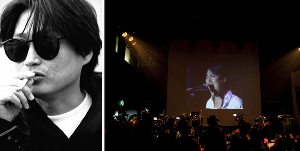 김현식은 쓸 만한 외모 ‘자본’을 가졌지만, 끝까지 ‘언더그라운드’의 태도를 견지했다. 김중만이 찍은 김현식(맨 왼쪽). 20주기 추모 음반 발표회 현장(왼쪽). <한겨레21> 김정효 기자.