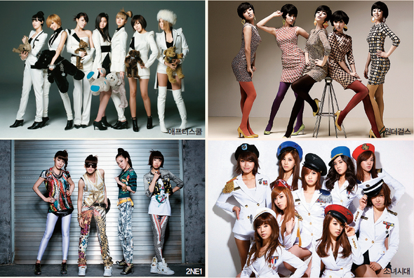 한국 걸그룹은 예외 없이 빼어난 각선미와 요염한 표정, 섹시한 춤과 의상을 선보인다. 직설적이고 날것 그대로의 섹시 코드다. (왼쪽 위부터 시계방향으로) 애프터스쿨·원더걸스·소녀시대·2NE1. 플레디스·JYP엔터테인먼트·SM엔터테인먼트·YG엔터테인먼트· 제공