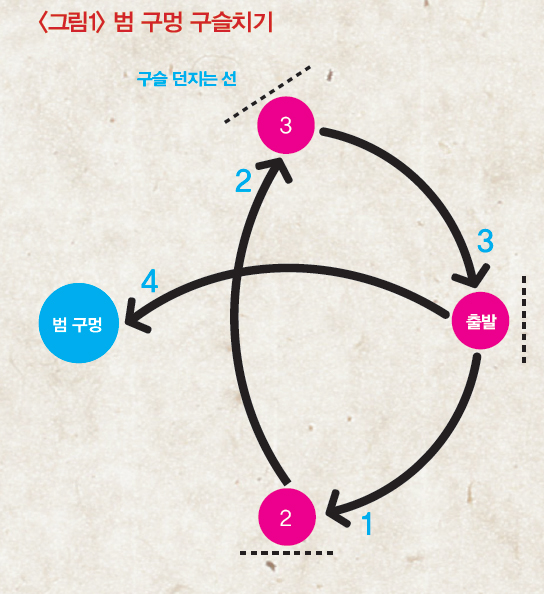 이긴 사람부터 ‘출발 구멍’에서 ‘2번 구멍’을 향해 구슬을 던져요. 구멍에 들어가면 성공, 아니면 실패. 실패하면 ‘출발 구멍’에 구슬을 넣고 순서를 기다려야죠. ‘2번 구멍’에 들어간 사람은 ‘3번 구멍’에 구슬을 던질 기회를 얻어요. 역시 실패하면 ‘2번 구멍’에 제 구슬을 넣어둬야죠. ‘3번 구멍’에 구슬을 넣었으면, 다시 ‘출발 구멍’을 향해 구슬을 퉁겨요. 이제 마지막으로 ‘출발 구멍’에서 ‘범 구멍’을 겨냥해 던지면, 와! 드디어 ‘범 구멍’에 들어왔어요. <그림1>의 화살표 순서를 따라 던지는 거예요.
