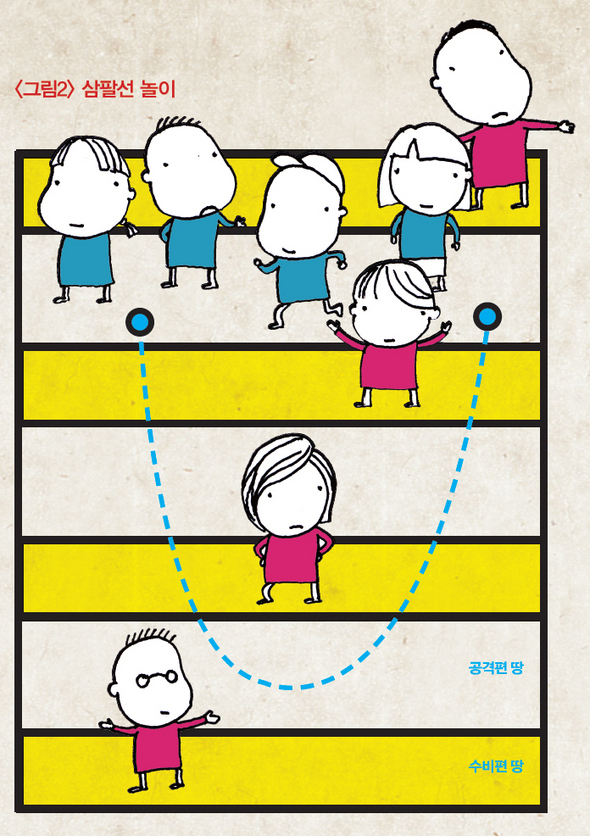 엄마의 귀띔: 많이 뛰어다니는 놀이니까 놀이터는 널찍하게 만드는 게 좋아. 아스팔트나 시멘트 바닥에서도 놀 수 있지. 분필로 놀이터를 만들면 되거든. 60여 년 전, 우리나라가 남북으로 처음 분단됐을 때, 그 경계선이 북위 38도선이었어. ‘38선’이라 불렀지. 군인들이 남북의 통행을 막았어. 그래도 사람들은 가족과 친구를 찾아 남과 북을 넘나들었지. 그러니까 ‘삼팔선 놀이’에는 고향길을 가로막은 군인들을 은근히 곯려주려는 마음이 깃들어 있어. 설이 되어도 고향에 가지 못하는 실향민이 여전히 많잖아. 재미난 놀이지만 참 많은 이야기가 담겼지?