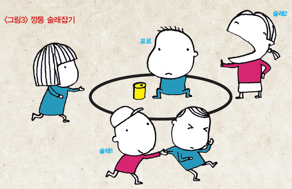 술래가 정해지면, 도망다닐 동무들이 깡통을 차례로 걷어차요. 가능하면 멀리멀리 차내는 게 도망다니는 쪽에 좋아요. 이제 술래는 그 깡통을 주워 원 안에 놓아야 해요. 그때부터 놀이가 시작돼요. 술래가 깡통을 제자리에 놓는 동안, 도망다니는 동무들은 멀리멀리 도망치는 거죠. 그러다 술래의 손이 닿으면 깡통이 있는 원 안에 쪼그리고 앉아 있어요. ‘포로’가 되는 거죠. <그림3>을 보면 금세 이해할 수 있어요.
