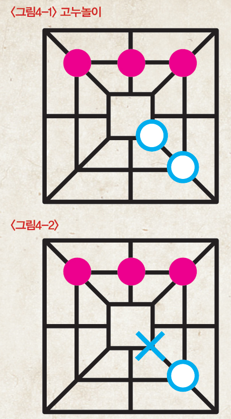 ‘고누’에는 고누 판에 따라 여러 종류가 있어요. 그중에 제일 까다로운 게 ‘참고누’죠. 우선 검고 흰 바둑알을 각각 10여 개 정도 마련해요. 고누 판은 <그림4-1>처럼 만들면 돼요. 두 사람이 번갈아 말을 하나씩 놓아요. 그러다가 말 3개가 일직선(가로·세로·대각선)으로 모이면 ‘곤’하고 말해요. ‘곤’은 ‘고누’에서 나온 말인 것 같기도 하고, 땅을 일컫는 <주역>의 괘를 이르는 것 같기도 해요. 어쩐지 멋있지 않아요?
