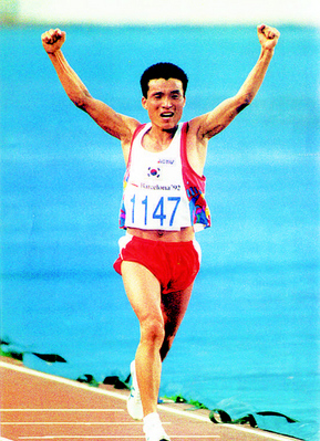 5. 56년 만의 올림픽 마라톤 제패 1992년 8월9일. 해가 뉘엿뉘엿 지고 있는 스페인 바르셀로나시 몬주익 메인스타디움에 가장 먼저 황영조가 들어섰다. 텔레비전을 지켜보던 국민은 벅찬 감동과 뜨거운 눈물로 밤잠을 설쳤다. 공교롭게도 이날은 1936년 베를린올림픽에서 손기정 선수가 나라 잃은 설움을 안고 금메달을 딴 지 꼭 56년 되는 날이었다. 바르셀로나올림픽 마지막 금메달의 주인공은 한국의 황영조 선수였다. 그런데 한 가지 재미있는 것은 이 대회 첫 금메달의 주인공도 한국 선수(사격 여갑순)였다는 것이다.