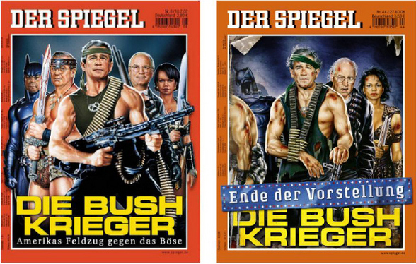 <슈피겔>이 2002년 미국의 이라크 침공 당시 선보인 ‘부시의 전사들’ 표지 일러스트레이션(왼쪽)과 6년 뒤 <슈피겔>이 다시 내건 ‘부시와 그 패잔병들’ 표지 일러스트레이션. 두 표지 모두 세계적인 이목을 끌어모았다.