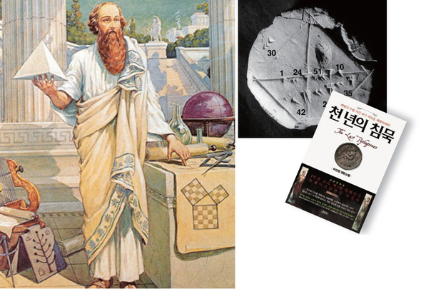 대한민국 뉴웨이브문학상 수상작 <천 년의 침묵>(오른쪽 아래)은 피타고라스(왼쪽)를 둘러싼 비밀과 음모를 소재로 했다. 이 소설에서 중요한 계기를 제공하는 바빌로니아 점토판(오른쪽 위).