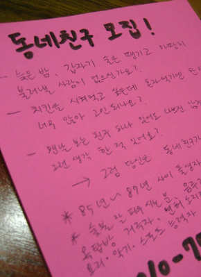 삼세번의 시도 끝에 이런 마음을 먹었다. 내가 직접 동네 친구 모임을 결성하자고. 남이 차려놓은 밥상이 마음에 안 들 땐 직접 차려먹어야지 어쩌겠는가. 가장 기본적인 방법, 손수 만든 유치한 전단지를 붙이는 거다. 색종이를 몇 장 꺼내 ‘동네 친구 모집’이라 적어본다. 무슨 말을 쓸까 고민하다가 웃음이 나온다. 봄비가 내린다. 저 비가 그치고 나면 담벼락에, 전봇대에, 육교 밑에, 마을 게시판에, 이 조그만 색종이 전단지를 붙여두고 누군가의 연락을 기다릴 것이다. 과연 어떤 결과가 나올지는, 다음회에 계속.