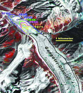 히말라야 빙하의 위성사진. 기후변화정부간위원회(IPCC)는 2007년 보고서에서 빙하 축소 속도를 신뢰할 수 없는 출처로부터 인용하며 과장했다는 의혹에 휩싸였다.