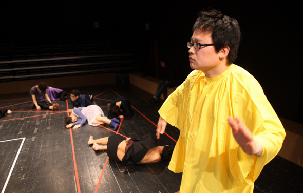 남화연 작가의 행위극 <오퍼레이셔널 플레이>에서 ‘움직이는 무대장치’로 열연한 하어영 기자. 사진 한겨레21 정용일 기자