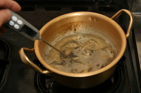 국물 온도를 새로 산 요리용 온도계로 재보았다. 채 끓지도 않은 국물의 온도는 77℃. 한겨레 고나무 기자