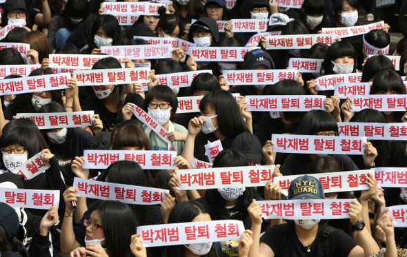 2009년 9월 재범의 2PM 탈퇴를 철회하라고 소속사 JYP 앞에서 시위를 벌이는 팬들. 한겨레 이종근 기자