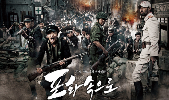 영화는 1950년 8월 포항여중을 사수하던 학도병들이 인민군과 접전을 펼친 실화와 당시 발견된 학도병의 ‘편지’를 뼈대 삼아, 학도병이라는 존재에 대한 감독의 상상을 살로 입힌다. 첫 시퀀스에서 펼쳐지는 화려한 전투 장면은 학도병(최승현)을 시점의 주체로 놓아 공포감을 배가한다. 부대는 포항으로 퇴각하고, 일군의 학도병들이 한 트럭 내린다. 영화는 이들의 ‘군기가 들지 않은’ 모습을 보여주며, 곧이어 학도병 간의 껄렁한 갈등을 담는다. 권상우는 <말죽거리 잔혹사>에서의 “한판 뜰까?” 모양새 그대로이고, 최승현은 ‘범생이’ 반장 역을 꾸역꾸역 해낸다. 마지막 전투를 앞두고 ‘한판 뜰’ 때 서로 “겁나면 도망가라” 외치는 장면은 이들이 자신의 공포를 외화하고 있을 뿐, 이들 간 갈등은 허깨비임이 드러난다. 영화가 살로 입힌 드라마는 응집력이 없다는 뜻이다. 영화는 학도병, 즉 ‘어린 군인’의 존재에 대한 고민을 두 번 드러낸다. 북한 소년병을 마주한 남한 학도병이 갈등하는 장면과 인민군 소좌(차승원)가 남한 학도병에게 투항을 권유하는 장면이다. 턱없이 어린 적을 대할 때 증오보다 연민이 앞서는 심정이 그려지는가 싶지만, 곧바로 정리된다. 북한 소년병은 “군인으로 죽을지언정 항복하지 않는다” 말하고 죽고, 남한의 학도병 역시 스스로를 ‘군인’으로 인식한다. 즉, ‘아무리 어려도 총을 든 이상 군인이요 적’임을 영화는 어린 군인의 입을 통해 발언하게 한다.
