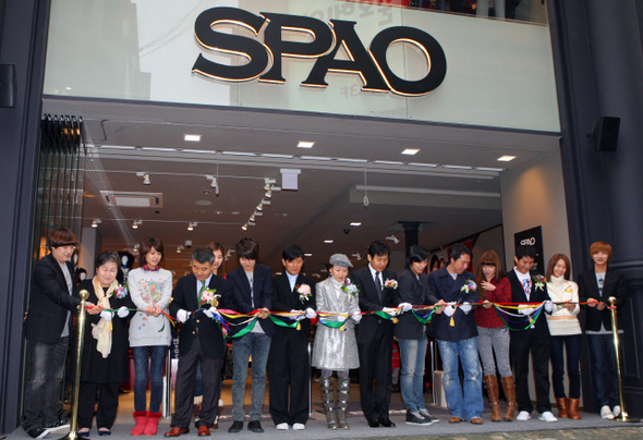 지난해 11월25일 서울 명동 스파오 매장에서 열린 SM엔터테인먼트와 이랜드월드의 업무제휴 조인식에 참여한 슈퍼주니어와 소녀시대가 테이프 커팅을 하고 있다. 아이돌은 이제 10대 팬덤을 넘어 ‘구조화된 문화자본’으로 읽힌다. 연합 유용석 기자