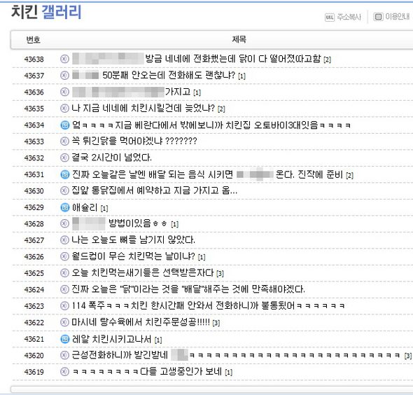 저녁 8시. 예정된 시간에 치킨은 오지 않았다. 치킨쥼은 전화가 되지 않았다. 경기가 시작된 8시40분쯤에야 겨우 치킨이 도착했다. 배달원은 땀을 뻘뻘 흘리고 있었다. 경기 결과는 4-1로 아르헨티나의 승리. 대한민국 16강 진출에 적신호가 켜졌다. 경기 뒤 치킨갤러리에도 적신호가 켜졌다. 그리스전과 비슷한 분위기로 변해 있었다. ‘은총의 땅’은 ‘분노의 땅’이 돼 있었다. “치킨 시킨 지 3시간 됐다. 치킨집 전화도 안 받네.” “정신적 피해로 손해배상 가능한 거지?” “골 들어갔는데 치킨도 못 먹는 더러운 인생.” |