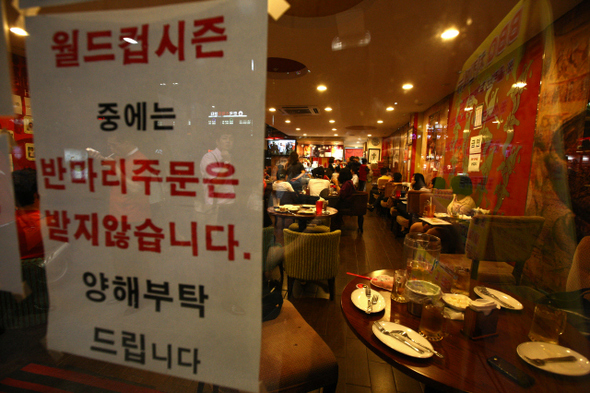 한국 대표팀 경기가 있는 날엔 치킨 소비량이 천정부지로 솟구친다. 6월17일 대목을 맞아 ‘반마리 주문은 받지 않는다.’고 써붙인 한 치킨전문점 모습. 한겨레21 류우종 기자
