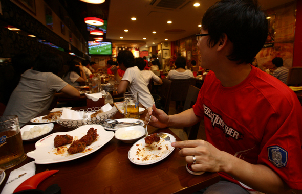 많은 축구팬들이 한 프랜차이즈 치킨전문점에서 치킨과 맥주를 먹으며 월드컵 경기를 응원하고 있다. 한겨레21 류우종 기자