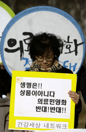 “이윤보다 생명을!” 지구촌 어디서나 절박한 구호다. ‘의료 민영화 저지 및 건강보험 보장성 강화를 위한 범국민운동본부’ 회원이 지난해 12월 정부의 영리병원 추진을 규탄하는 시위를 벌이고 있다. 한겨레 김명진 기자