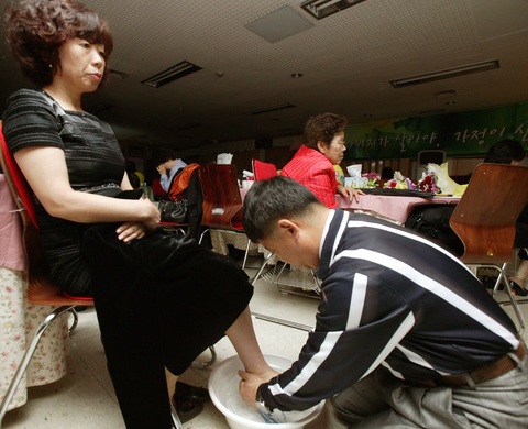 부부관계는 인간관계의 꽃이고, 성생활은 부부관계의 꽃이다. 서울의 한 구청이 진행한 ‘아버지 교육’에서 아내의 발을 씻겨주는 남편들. 한겨레21 류우종 기자