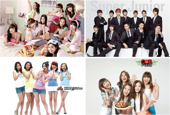 상황이 이렇다 보니 프랜차이즈들의 홍보 경쟁에 불이 붙는다. 최근 치킨 광고에 기용되는 이들은 다름 아닌 아이돌이다. 10대에 한정적이던 아이돌의 인기가 대중적으로 확대되면서, 역시 전 연령에게 인기를 누리는 치킨을 광고하기에 적합하다는 판단일 테다. 소녀시대(굽네치킨), 원더걸스(BBQ), SS501의 김현중(핫썬치킨), 빅뱅의 대성(BHC), 슈퍼주니어(교촌치킨), 티아라(네네치킨), 샤이니(멕시카나), 포미닛(다사랑치킨), 시크릿(구어스치킨), 브라운아이드걸스(불로만치킨), 2AM(BHC), 비스트(BBQ), 제국의 아이들(맘스치킨), 카라(구어조은닭), 유키스(본스치킨) 등 ‘아이돌이라면 치킨 광고’라는 등식마저 성립될 지경이다.
