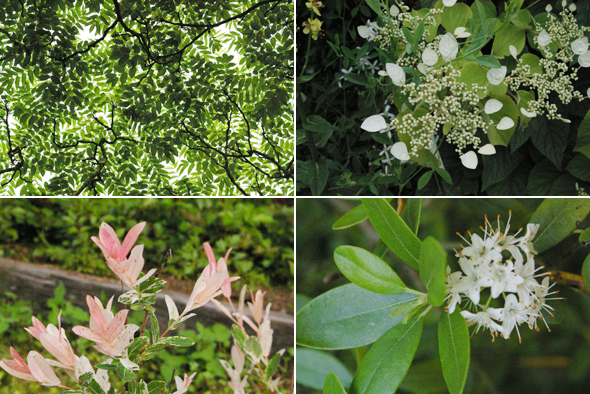 여름에는 흰 꽃이 대세다. 녹색을 이기기 쉽지 않아서다. 왼쪽 위부터 시계방향으로 머귀나무 아래서 바라본 잎, 바위수국, 꼬리진달래, 개키버들.