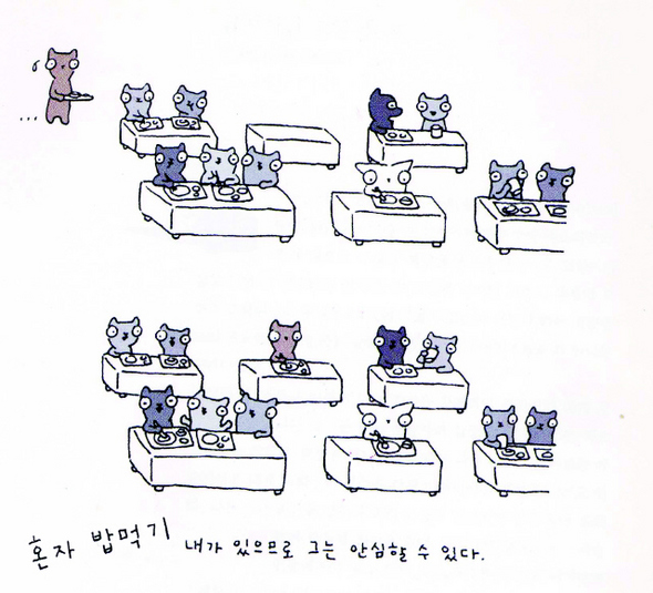 즐겁게 ‘혼자 놀기’는 ‘사회’가 필요하다. 스노우캣의 ‘혼자 놀기’ 마지막 편 ‘혼자 밥 먹기’는 두 컷의 만화다. 여럿이서 앉아 밥 먹는 가운데 스노우캣이 혼자 앉아 있고, 그 뒷자리로 다른 혼자 먹는 고양이가 앉는다. “내가 있으므로 그는 안심할 수 있다.” 누구나 혼자가 안 되어본 적은 없다. 우리는 ‘혼자 놀기’ 훈련생들이다. 혼자-혼자-혼자-혼자-혼자…들.