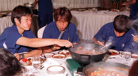 선수 식단을 관리하는 것도 팀 전력 상승에 매우 중요하다. 2002년 6월25일 한-일 월드컵 한국대표팀이 숙소 식당에서 점심을 먹고 있다. 한겨레 자료