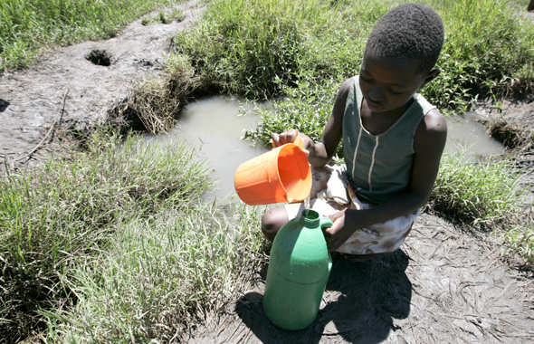 짐바브웨의 한 소녀가 고인 물을 마시기 위해 물병에 담고 있다. 아프리카 빈곤국의 기생충 감염률을 낮추려면 기생충약 처방보다 열악한 위생 환경을 개선하는 것이 우선이다. REUTERS/ Philimon Balawayo