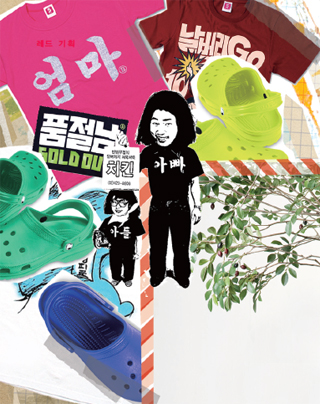 뻔뻔한 글자의 한글 티셔츠, 플라스틱 크록스 신발로 벌이는 청춘남녀의 생활 퍼포먼스.