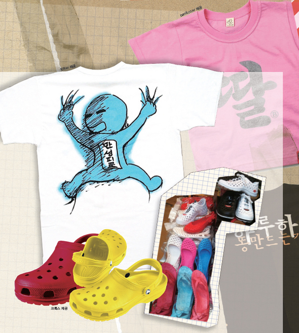 ‘자아 티셔츠’는 내면의 이야기를 끄집어낸다. 크록스는 플라스틱을 거리로 진출시켰다. 크록스가 수입되고 비슷비슷한 상품들이 쏟아져나왔다(위 오른쪽). 한글 글자 티셔츠 역시 길거리 매대에서 많이 볼 수 있다. 크록스 · t0 9.kr · ban8.co.kr 제공