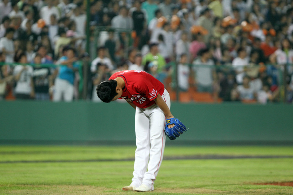 8월24일 부산 사직구장에서 열린 기아 타이거즈와 롯데 자이언츠의 경기 9회말 투아웃에서 롯데 조성환의 헬멧을 야구공으로 맞힌 기아의 윤석민이 경기 종료 뒤 관중석을 향해 고개 숙여 사과하고 있다. 연합