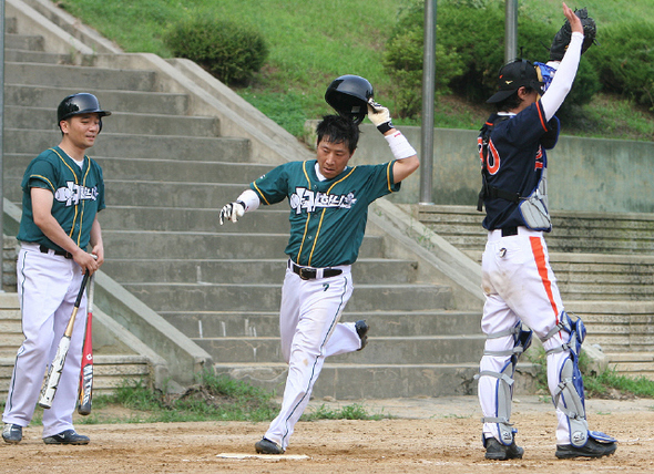이본영 선수에 가려 빛을 잃었지만 최근 두 경기에서 전 타석 출루한(혹은 그런 것으로 기억되는) 박성영 선수와 투수면 투수, 포수면 포수, 좌익수면 좌익수 어느 자리에 가도 듬직한 김용득 선수의 성장세도 놀랍다. 박성영은 “태어나서 처음 야구를 한다”고 했는데, 수단과 방법을 가리지 않고 출루하고 한 번 출루하면 3루까지 훔치는 발을 가지고 있어 부동의 1번타자다. 김용득은 포수 자리에서 도루를 잡기 위해 2루로 공을 던지면 베이스를 훌쩍 넘어가고, 외야수를 할 때는 홈까지 직선으로 던지는 강한 어깨를 가졌다. 박성영과 김용득은, 금요일에 축구하고 토요일엔 야구하고 일요일을 농구로 마무리하는 만능 스포츠맨이어서 ‘초짜’로 시작했음에도 팀의 주력이 됐다.
