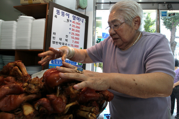 1957년 꽃밭이던 자리에 ‘하꼬방’으로 차린 가게였다. 지금은 서울 장충동 신세계건설 빌딩이 있는 자리다. 코딱지만 한 가게에 비좁게 탁자 4개를 뒀다. 가게 이름은 ‘함경도집’이라 했다. 빈대떡과 만두를 팔았는데 손님들이 술안주를 찾았다. 어린 시절 만주 살 적에 평안도 출신 어머니가 입에 넣어주시던 보드라운 족발이 생각났다. 식은 다음에도 쫀득쫀득하던 게 별미였다. 남대문시장에 가서 돼지 족발을 떼왔다. “장사를 하려면 머리를 써야지. 물 붓고 삶으니 좀 심심해. 간장을 한 사발 내다가 부었어. 간이 배니까 맛있어. 그 국물을 버리지 않고 삶으니, 삶을수록 맛있어져.” 할머니는 6·25 전쟁 때 피난 간 부산에서 옷장사를 하면서 돈을 처음 만졌다. “웃옷을 4천원에 사서 8천원에 팔고, 즈봉(바지)을 8천원에 사다가 2천원을 남겼지. 그것도 장사 나간 처음에는 3일 동안 하나도 못 팔았어. 아무것도 못 파니 마음이 답답해 집에를 못 들어가. 나흘째에 하나 팔고는 집에 들어가 밥을 먹었지.” 장사가 끼니보다 우선이었다. 돈이 있으니 자신감도 붙었다. 서울에 올라온 뒤에도 장사를 계속했다. “마음이 순하고 좋아서 어떻게 경찰을 했는지 모르겠는” 남편 대신이었다. 미군 물건을 받아 팔았다. “물건 위에 배추를 얹었는데도 형사가 따라붙어. 그런데 제일 안전한 곳이 어딘지 알아. 시경 지하야. 거기서 장사를 하는 줄 누가 알겠어?” 장사가 잘됐다. 동업한 3명이 1천원짜리를 쌓으면 머리에 닿을 정도(할머니는 의자에 앉은 채로 손을 머리 높이에 갖다 댔다)로 벌었다. “근데 쉽게 들어온 돈은 쉽게 나가더라고.” 은행에도 안 넣고 쌓아놓은 돈이었으나 남에게 빌려주고 나니 남의 돈이 되었다. 다시 시작한다는 마음으로 차린 것이 식당이었다. 옷장사를 할 때의 아이디어와 수완은 식당에서도 통했다. 돼지족을 보들보들 북쪽 식으로 삶은 것도 별미였지만, 곁들이는 것으로도 맛을 돋웠다. 녹두를 갈아 지져 녹두전을 같이 냈다. “지금은 녹두 한 가마에 50만원씩 해. 쌀 적에 서비스하기 시작했는데 비싸다고 안 할 순 없잖아.” 할머니집에는 보물창고가 있었다. “텔레비전에서도 많이 찍어갔어. 동굴이 있는 집은 대한민국에 이곳 하나일 거야. 전쟁 때 방공호로 썼던 걸 거야.” 이곳에다 된장과 고추장, 새우젓 단지를 넣는다. 3~4년 쓸 분량의 단지가 채워져 있다. 묵은 것부터 차례대로 내어 쓴다. 고추는 강원 양양에서 올라오고 새우젓은 인천 조카가 하는 배에서 넘겨받는다. 함경도집은 아줌마 족발, 할머니 족발이 되고