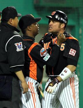 5월20일 전북 군산 월명야구장에서 심판에 항의 하는 롯데의 가르시아 선수(오른쪽)를 로이스터 감독이 말리고 있다. 연합