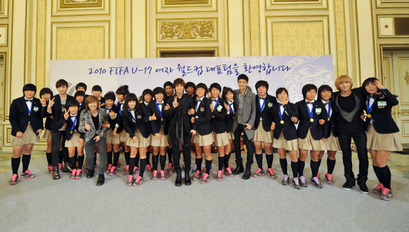 17살 이하 여자 월드컵에서 우승한 선수들이 9월29일 청와대에서 열린 이명박 대통령 초청 오찬에서 그룹 샤이니와 함께 즐거워하고 있다.연합 조보희