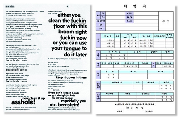 나, 그리고 당신도 한번쯤 자기소개서를 써본 적이 있을 것이다. 자기소개서 양식으로 통용되는 문서는 인터넷에서 무료로 다운받을 수 있을 만큼 희소가치가 없다. 이력서, 자기소개서, 가슴에 붙이는 수험서는 모두 초등학교 때 처음 만난, 줄줄이 칸칸이 토막 난 받아쓰기 노트처럼 기억에서 지워지지 않는 뿌리 깊은 시각적 형태다. 방에서 은밀하게 꺼내보는 사각형 문서 안에는 줄과 사각형뿐이다. 수직과 수평으로 나뉜 칸마다 수사가 빠진 건조한 정보들이 채워진다. 얼굴 사진은 문서 가장자리 네모난 칸에 올라오고, 연속성을 찾을 수 없는 지그재그 행동은 연대기 순으로 한눈에 들어오게 정렬된다.