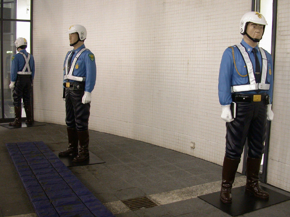 경찰 마네킹의 성공이 놀라운 것은 그만큼 거리를 지키는 경찰 마네킹들의 외관이 허술하기 때문이다. 나도 요즘 서울 용산역 근처에 있는 가짜경찰관을 가련한 눈으로 바라보고 있다. 길 한 모퉁이에 서있는 마네킹은 첨단 로봇도, 쇼윈도 조명을 받은 마네킹도 아닌 3D 노동자의 형상을 하고 있다. 급하게 만든 허수아비처럼 헐벗은 몸에 누가 옷이라도 잘 입혀주면 좋겠다 싶을 만큼 그의 행색은 초라하다. 예민한 경찰관이라기보다 남루한 거리의 부랑아처럼 보이지만 제 모습을 아는지 모르는지 주황색 봉을 들고 위아래로 두 팔을 부지런히 내렸다 올렸다 한다.