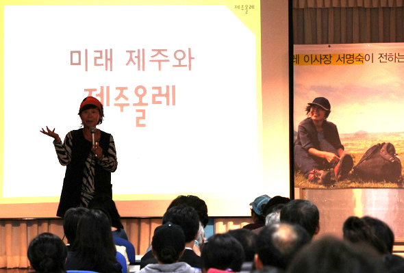 서명숙 제주올레 이사장이 10월18일 서울 종로구 정독도서관에서 강연하고 있다.한겨레 류우종