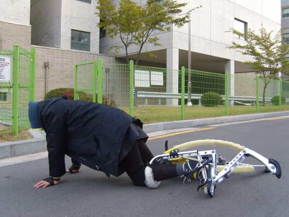 사정을 아는 남자친구는 부러 더 엄숙하게 의식을 거행하려 하고, 따라나선 ‘찍사’도 신이 났다. 나는 도살장에 끌려가는 판다가 되어 아침 해가 뜨자마자 점핑부츠를 짊어지고 후문 앞으로 갔다. 그냥 기권하긴 싫었다. 그리고 마침내 뛰어넘으려고 힘을 잔뜩 실어 스프링을 누르는 순간, 깨달았다. 기권하는 게 나을 걸 그랬지. 후문을 넘기는커녕, 참혹하게 넘어졌다. 아프기도 했지만 웃음이 먼저 터져나왔다. 그렇게 ‘무모한’ 도전은 한바탕 웃으면서 막을 내렸다.