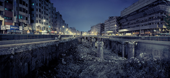 안세권은 아파트 16층 높이에서 땅 위에 펼쳐지는 z축의 횡포를 내려다본다. 2003년부터 5년간 진행한 <서울, 뉴타운 풍경> 시리즈 작업에 담긴 월곡동 뉴타운 개발 공사 현장 사진에는 재개발 주택들이 어둠 속에 낮게 깔려 있고 그 맞은편에 새로 건축된 아파트가 밝게 서 있다. 주택 높이와 아파트 높이 사이에서 얼핏 현기증이 느껴진다. 2004년에 촬영한 청계천 사진은 보는 이를 압도한다. 뜯겨나간 청계고가와 부서진 교각 기둥, 잘려나간 철근은 컴퓨터 그래픽이 아닐까 의심케 한다. 이 사진 속 풍경은 더 이상 현실에 존재하지 않는다. 뉴타운 개발은 최원준의 작업으로 이어진다. 은평 뉴타운 공사 현장에서 찾아낸 군사시설의 흔적에서 최원준은 “도시 사이의 권력관계 위에 국가 간의 권력관계, 그 위에 자본주의 논리로 점철된 그물망이 희미하게 보이는 순간”을 찾아낸다.