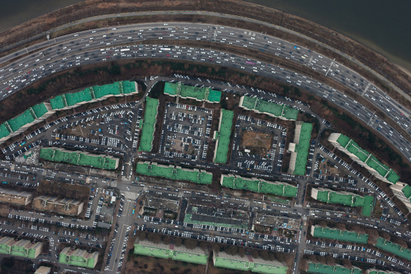 사진가 이득영은 헬리콥터를 타고 z축의 꼭대기에 오른다. 이득영은 2006년 자전거를 타고 간이매점을 촬영한 <69개의 간이매점>, 2008년 헬리콥터를 타고 한강을 찍은 <25개의 한강다리>와 유람선을 타고 한강을 찍은 <유람선>, 2009년 헬리콥터를 타고 확장된 도시를 촬영한 <테헤란> 등의 작업을 해왔다. 이번 전시에는 지금까지 헬리콥터를 타고 찍은 결과물을 재구성한 작품 <인지적 지도 그리기>를 선보인다. 평당 최고가를 자랑하는 강남의 아파트가 만들어내는 리드미컬한 풍경과 마지막에 툭 하고 던져진 개포 구룡마을의 불규칙한 풍경 사이에서 도시의 두 얼굴이 엿보인다.