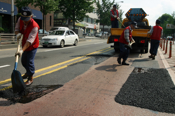 <서울과 노동시>는 서울에 대한 맹목을 경계하고, 서울을 구성하는 다양한 삶의 양상과 욕망의 풍경을 마주 보게 한다. 서울 시내에서 노동자들이 버스 중앙차로 보수 공사를 하고 있다.한겨레 자료