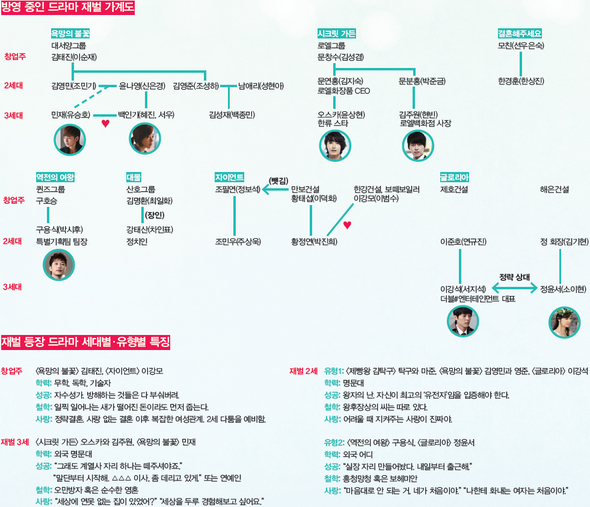 방영 중인 드라마 재벌 가계도(위) / 재벌 등장 드라마 세대별·유형별 특징(아래).