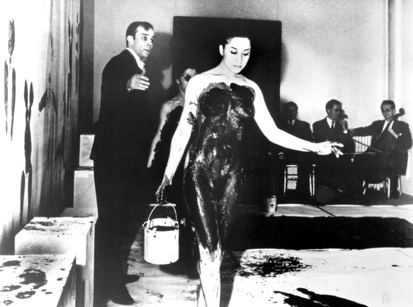 이브 클랭(왼쪽)이 1960년 5월9일 파리의 국제현대미술갤러리에서 <청색 시대의 인간측정학>을 시연하고 있다.