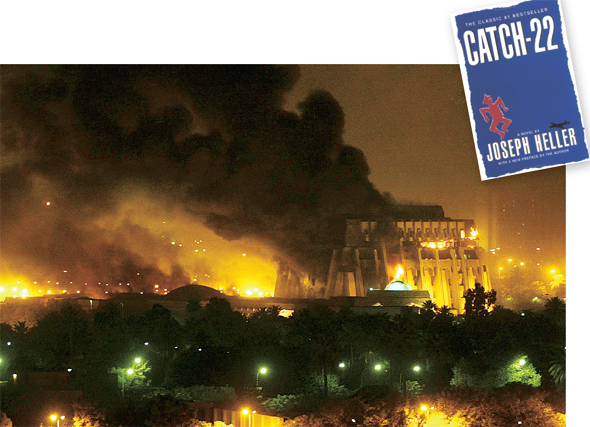 이라크 침공은 ‘거짓말’로 점철된 전쟁이었다. 2003년 미·영 연합군의 공격으로 불타고 있는 바그다드. 오른쪽 위는 조지프 헬러의 . REUTERS