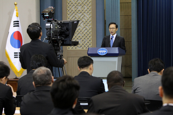 이명박 대통령이 11월29일 청와대 춘추관에서 연평도 사태에 대한 대국민 담화문을 발표하고 있다. 이날 담화문은 ‘대북 강경 대응’을 담고 있었다.