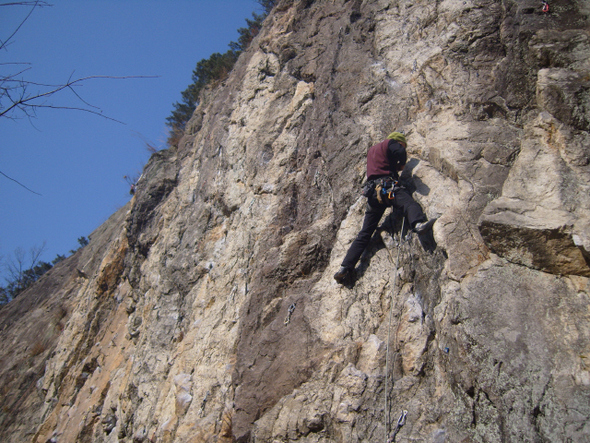 초보자 코스는 한 피치(20~30m) 높이에 비교적 큰 홀드들이 있는 곳이었다. 그렇다 해도 내가 보기엔 밋밋하고 높은 암벽이다. 드디어 내가 올라갈 차례. 암벽화를 신고, 안전벨트를 허리에 차고, “출발!”이라고 복창했다. 가슴이 터질 것 같았다. 목표점은 보이지도 않았다. 두 발을 모두 바위에 딛고 나니 벌써 다리가 후들거리기 시작했다. (다음번에 계속)
