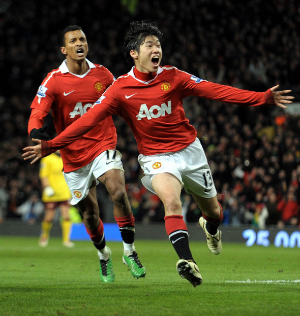 맨체스터 유나이티드의 박지성이 지난 12월14일 영국 맨체스터 올드트래퍼드에서 열린 아스널과의 경기에서 전반 41분 헤딩골을 넣고 환호하고 있다.연합AP