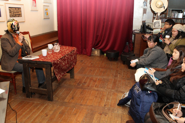 번화하고 안온한 거리를 지나 당인리발전소 방향으로 꺾어들었다. 골목은 한 발짝만큼씩 더 어두워졌다. <한겨레21>과 인터넷 서점 알라딘, 창작과비평사가 공동 주최한 ‘작가와의 만남’을 위해 많은 이들이 그 어두운 골목을 더듬어 ‘만남의 장소’로 모여들었다. 그리고 시커먼 골목 어귀에서 반짝이는 무언가가 나타났다. 박민규는 조도가 낮은 그 거리에서 행여나 사람들이 자신을 못 찾을까, 황금색 복면을 얼굴에 쓰고 있었다.