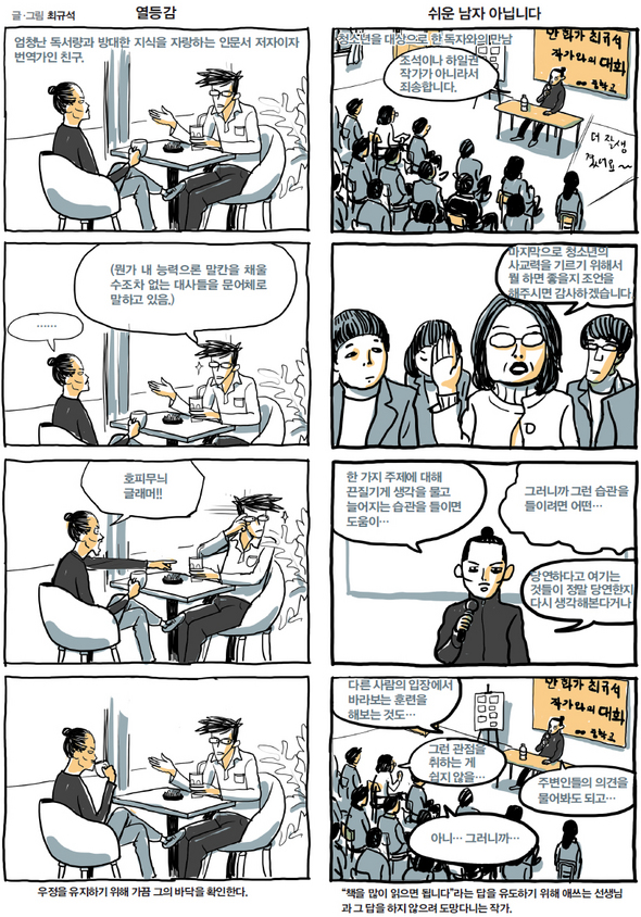 페이스북 0트위터 0공유네이버블로그카카오스토리카카오톡 공유하기스크랩프린트크게 작게[북 카툰] 북 카툰 - 열등감(왼쪽) / 쉬운 남자 아닙니다 (※클릭하시면 더 크게 보실 수 있습니다.) 북 카툰 - 띠지(왼쪽) / 위험한 독서 (※클릭하시면 더 크게 보실 수 있습니다.) 한겨레와 함께 걸어주세요섬세하게 세상을 보고 용기있게 기사를 쓰겠습니다.후원하기후원제 소개좋은 언론을 향한 동행,한겨레를 후원해 주세요한겨레는 독자의 신뢰를 바탕으로 취재하고 보도합니다.후원하기후원제 소개당신의 가치를 후원으로 얹어주세요평화를 갈망하는 마음, 평등을 지향하는 마음,환경을 염려하는 마음...후원하기후원제 소개����출판손들고 과학을 말할 때 재난을 막고 세상이 바뀐다정치가 실패하면 사랑도, 가정도 무너진다‘서울 구로동’ 하면 떠오르는 것들한겨레21 인기기사제 1587호20251031차례보기지난호보기낱권구입구독신청한겨레 인기기사