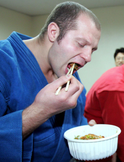 한국에 5~6차례 방문하며 표도르가 남긴 에피소드도 많다. ‘표도르 개고기 사건’도 그 가운데 하나다. 2006년 1월이었다. 러시아 삼보 시범경기를 위해 한국을 방문한 표도르가 서울 잠실 역도경기장 로커룸에서 일회용 포장용기에 담긴 고기를 먹었다. 이 장면은 인터넷을 타고 전세계에 퍼졌다. 문제의 고기는 다름 아닌 개고기 수육이었다.